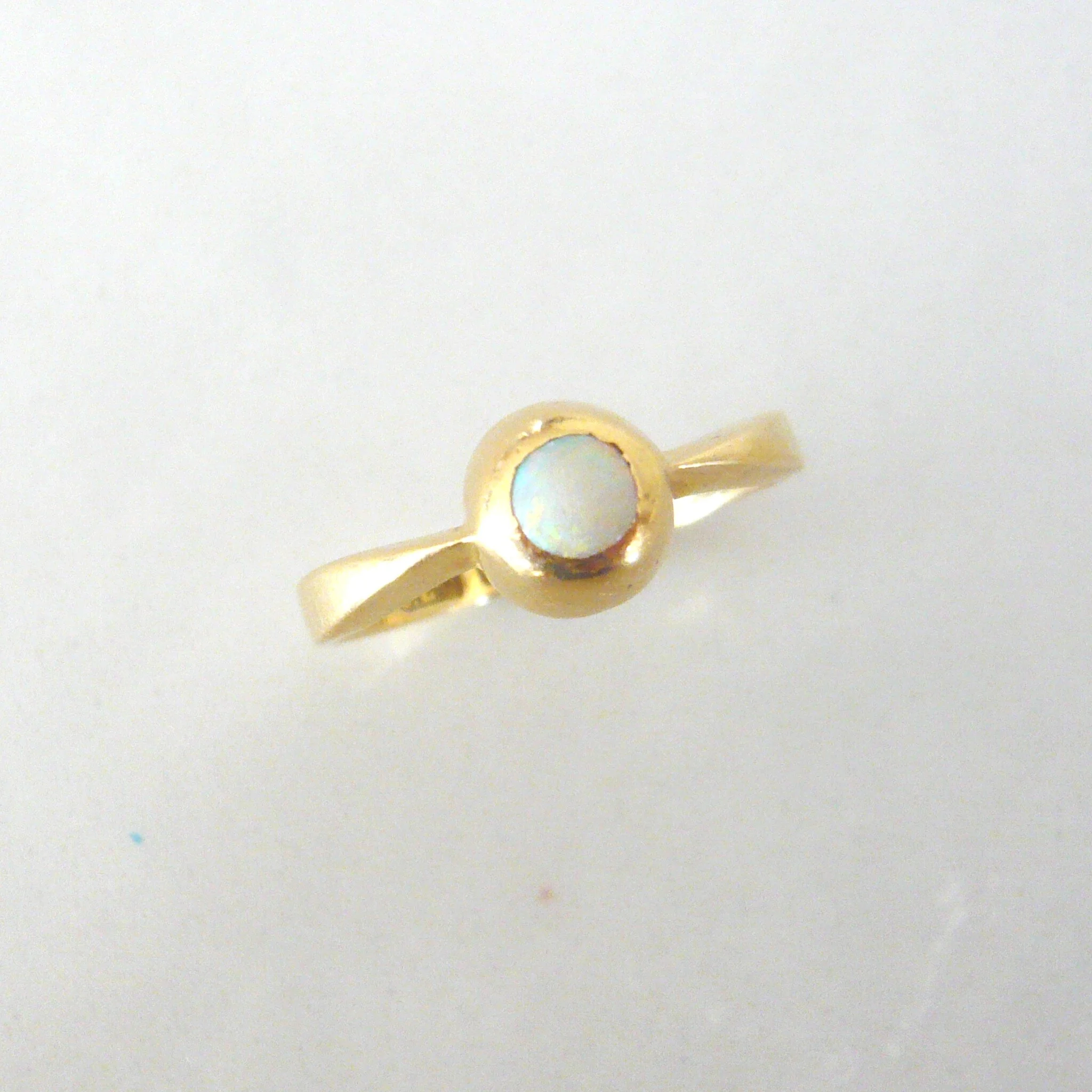 A simple ring from the Edwardian period, dated Chester 1913. The ring is made from solid 18ct gold and has a lovely crisp English hallmark on the inside of the shank. It is a beautiful understated design with a little opal in a fairly chunky (for the size of stone) rub over setting. The opal is fairly rubbed, though it still exhibits plenty of fire and a rainbow of colours throughout. A perfect period ring for stacking and a lovely quality piece.