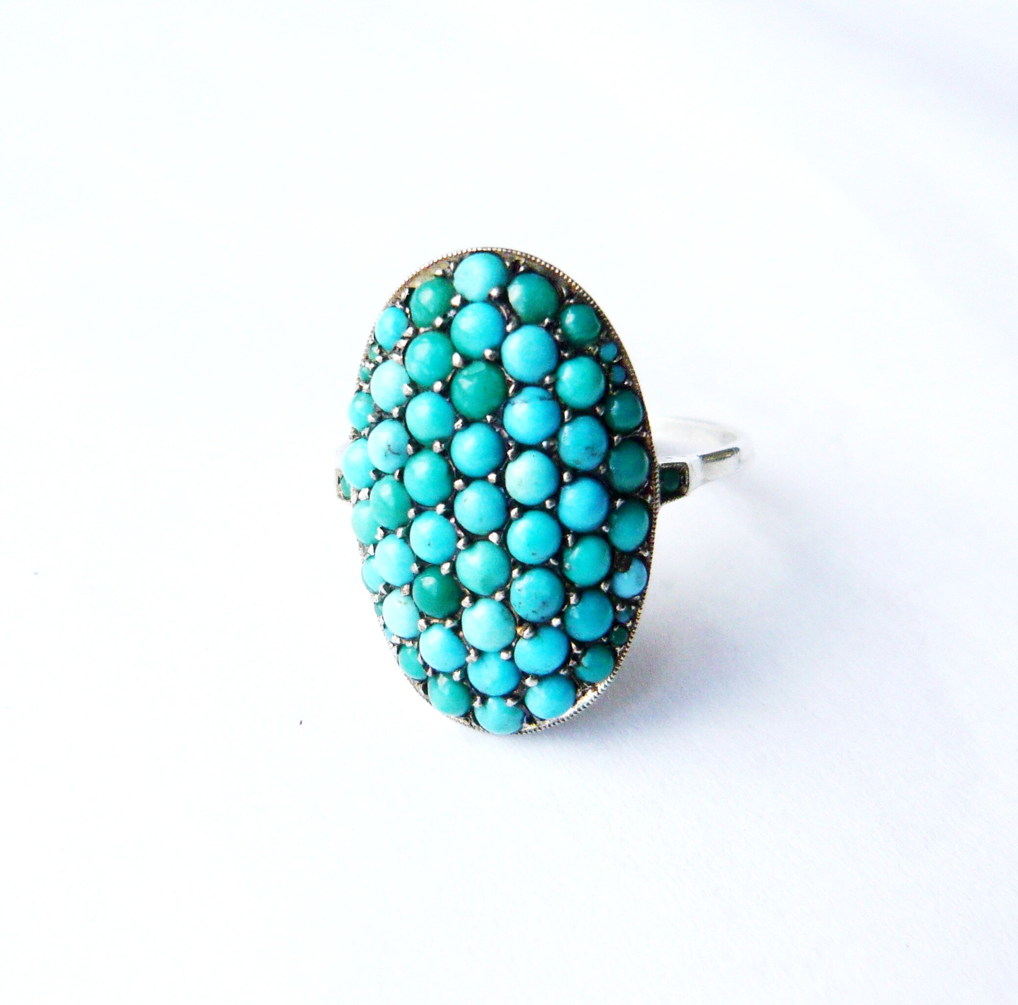 A wonderful ring from the early 20th Century, c1930s. The ring is made from sterling silver, marked on the back, and has a lovely oval panel top. The top is set throughout with natural turquoise that shows a lovely gradation in colour, commensurate with age. It is a fairly large top making a lovely statement on the hand and is finished with two little turquoise set in square settings on the shoulders of the shank.