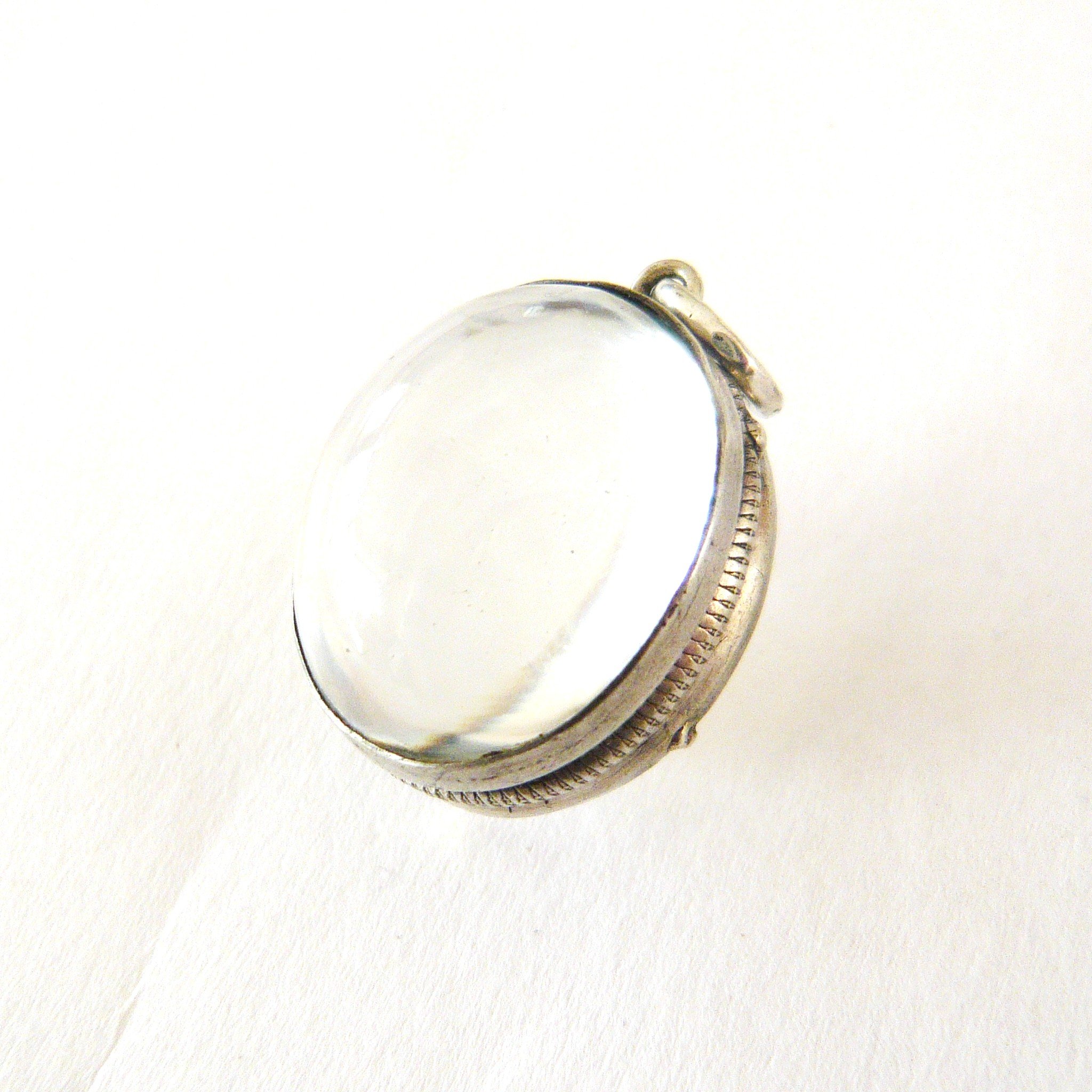 A beautiful example of these lovely lockets that have become highly sought after in recent years. The frame of the locket is made from silver and has a lovely solid appearance with a ridged design around the edge. Set in the frames are two beautiful large cabochon cut rock crystals. They are domed to the outside and flat on the inside, as is customary of the cabochon cut, and this allows you to add photos inside if you wish. There is a lovely play of light through the stones and the stones in this particular example are very beautiful.