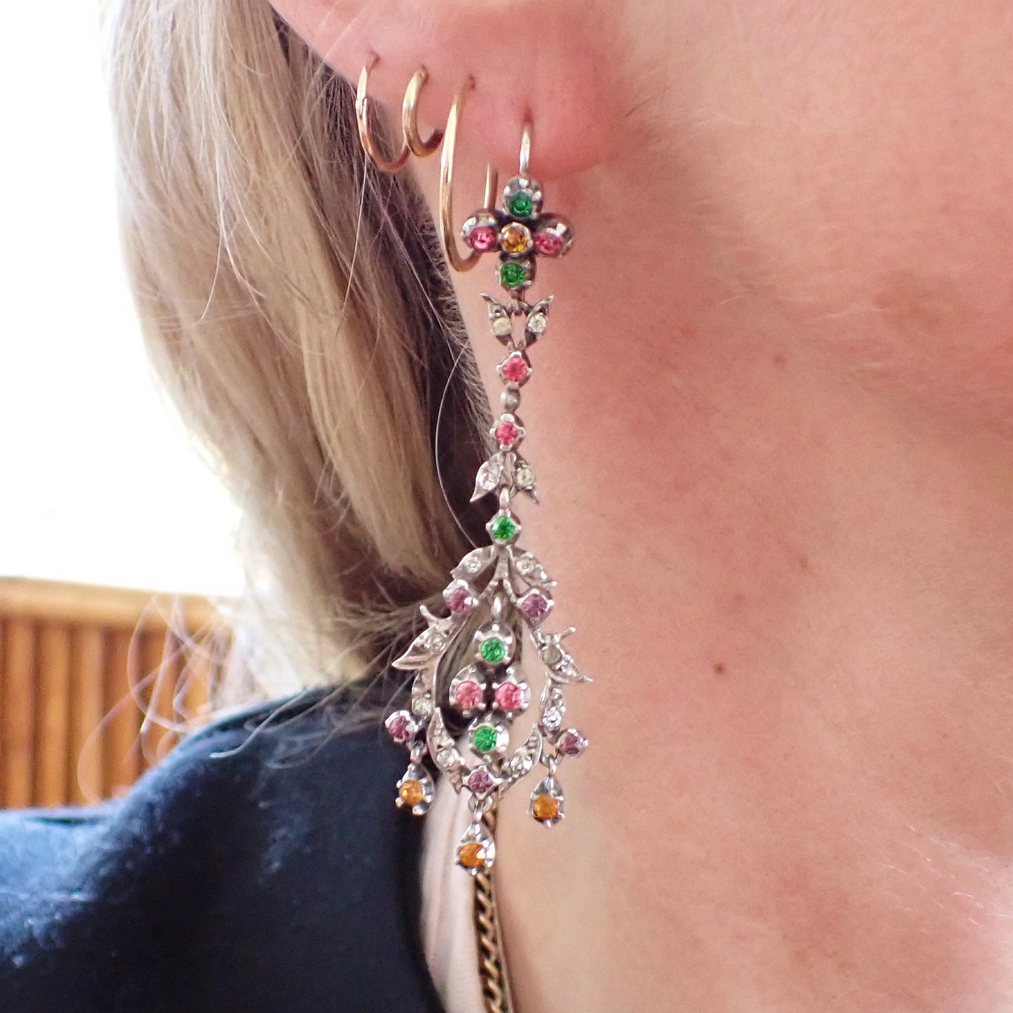 A gorgeous pair of Edwardian earrings, c1905. The earrings are made from silver and have a wonderful array of colourful paste stones set into the large drops. The colours include orange, green, purple, pink and clear paste. There is some lovely movement in them when they are worn as the three little drops move freely at the bottom and the earrings are articulated throughout. Such a pretty statement pair.