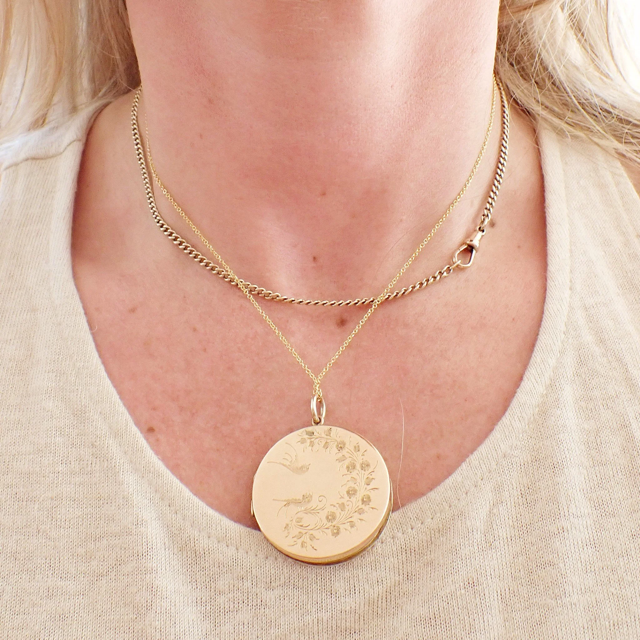A beautiful, larger sized locket from the Edwardian period. The locket is made from 9ct gold to the back and the front with metal inserts as is often customary of lockets from this period. It is beautifully engraved to the front and the back with two swallows playing amongst the flowers. The engraving is the same on each side. Inside, there are two frames that can be removed to place your own photos inside.