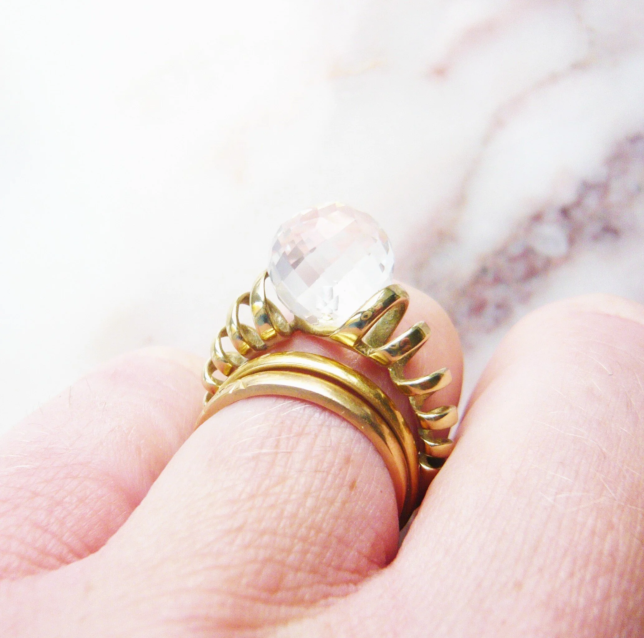 An unusual and fun ring from the late 20th Century. The ring is made from 9kt gold and has an interesting open twist design to the shoulders. At the centre is an amazing rock crystal ball that sits proud of the finger and is beautifully faceted. A fabulous look and very eye-catching on the hand.